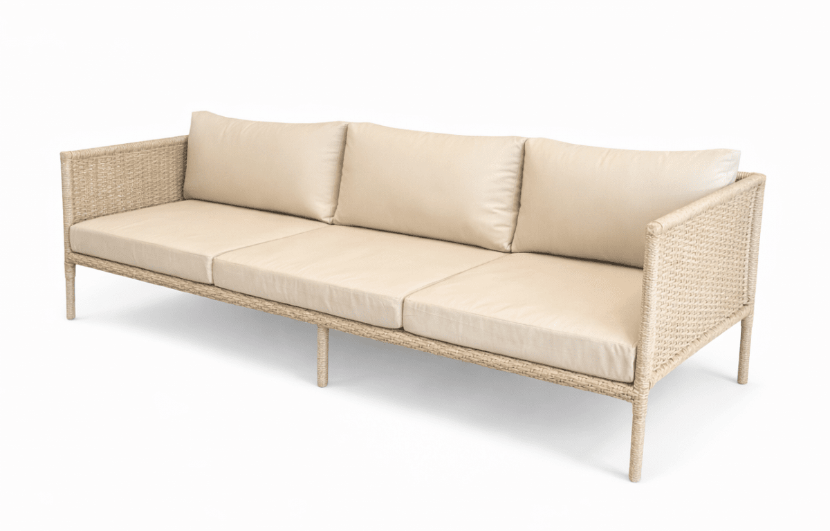 Denna soffa är tillverkad i konstrotting där fibern är genom färgad och därför UV-resistent. Så den bleks inte av solen. Den förblir sval även när möbeln står länge i solen. Konstrottingen är ISO-certifierad (internationellt accepterad standard).