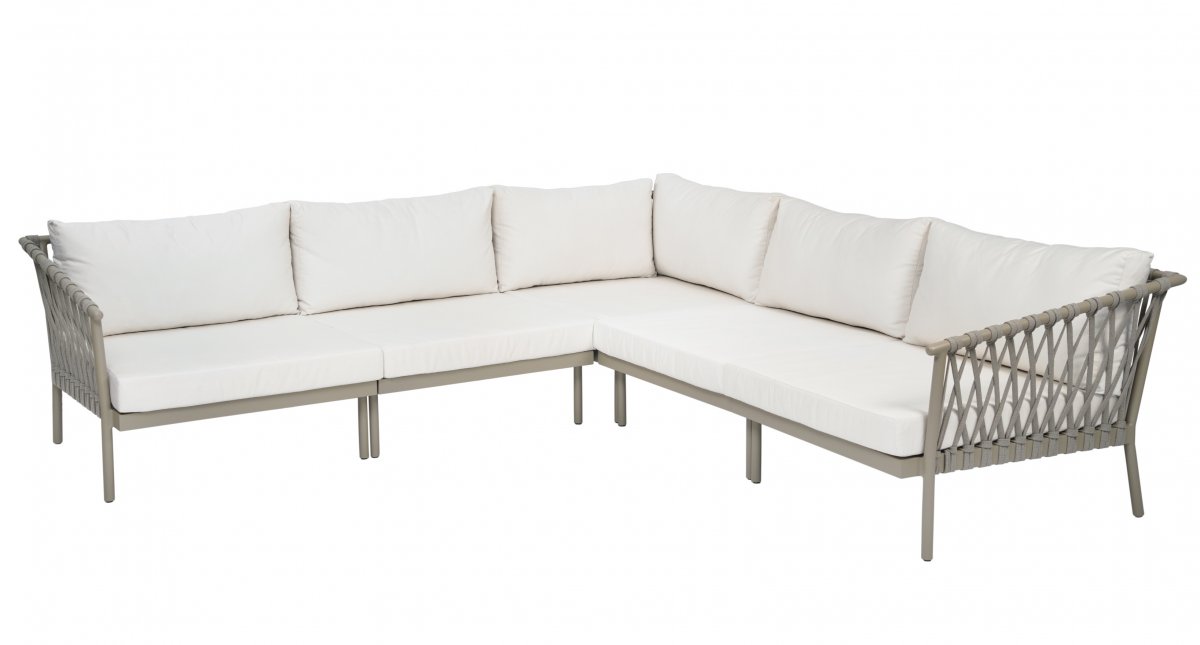 I hörnsoffan ingår det sitt/ryggdyna i Sunbrella som är en båttygsväv (60000 MD) som är 100% UV-beständig. Tyget är special behandlat mot mögel, fett, smuts och föroreningar, vilket gör det till en perfekt utomhustextil.