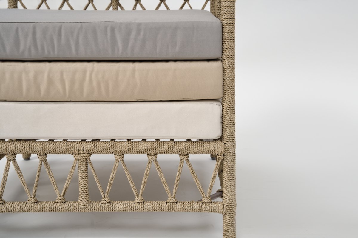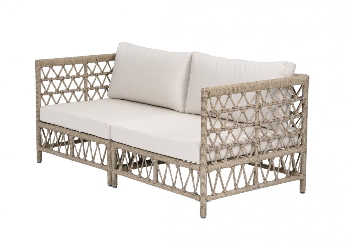 Denna soffa är tillverkad i konstrotting där fibern är genom färgad och därför UV-resistent. Så den bleks inte av solen. Den förblir sval även när möbeln står länge i solen. Konstrottingen är ISO-certifierad( internationellt accepterad standard). Den levereras med sits- och ryggdynor i Sunbrella tyget som är en båttygsväv (60000 MD) som är 100% UV-beständig och vattentålig. Tyget är special behandlat mot mögel, fett, smuts och föroreningar, vilket gör det till en perfekt utomhustextil.