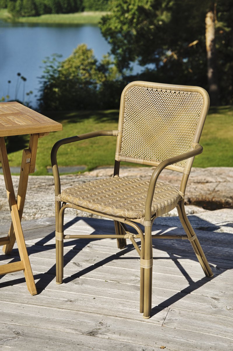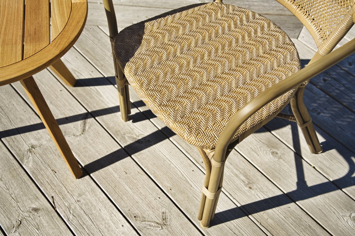Denna stol är tillverkad i konstrotting där fibern är genom färgad och därför UV-resistent. Så den bleks inte av solen. Den förblir sval även när möbeln står länge i solen. Konstrottingen är ISO-certifierad( internationellt accepterad standard). Dyna Vreta finns i polyester och i Sunbrella tyg som går att komplettera med.