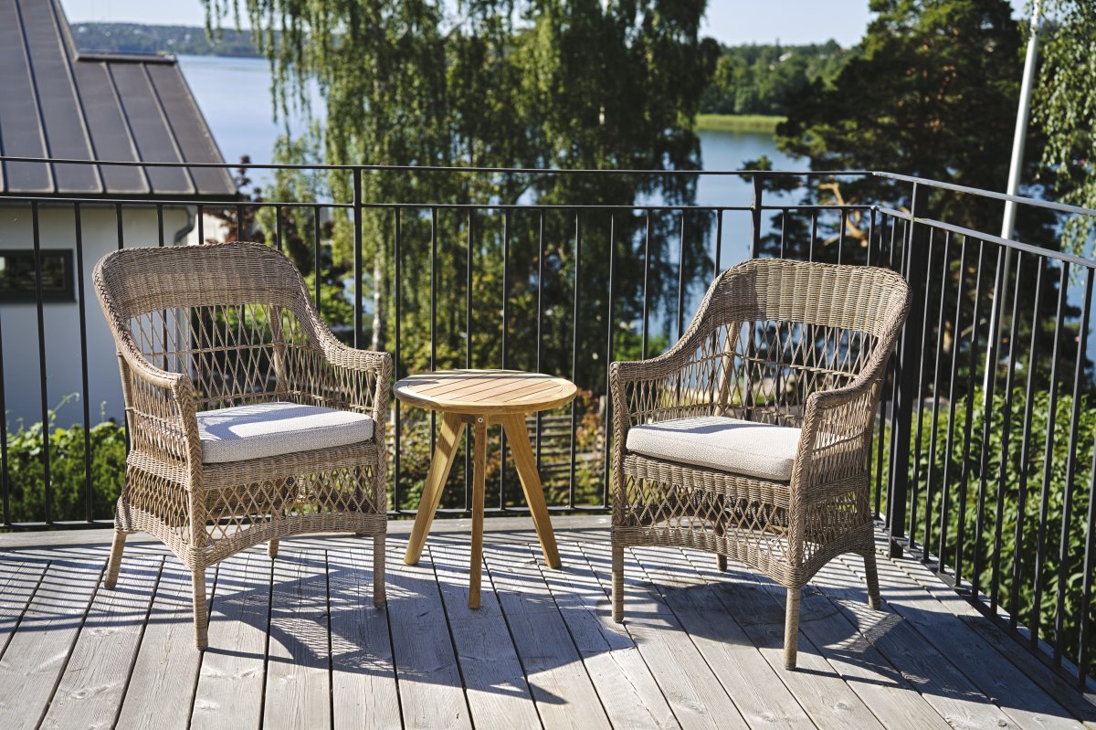 KONSTROTTING rengörs med fuktig trasa och plastrengöring eller ett milt diskmedel. Högtryckstvätt får inte användas! Möblerna kan med fördel förvaras utomhus vintertid eftersom de tål upp till 25 minusgrader, gärna under ett möbelskydd, däremot behöver man ta in dynorna. Konstrotting fibern är genom färgad och därför UV-resistent, så den kommer inte att blekas i solen.