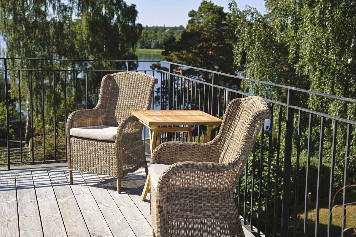 KONSTROTTING rengörs med fuktig trasa och plastrengöring eller ett milt diskmedel. Högtryckstvätt får inte användas! Möblerna kan med fördel förvaras utomhus vintertid eftersom de tål upp till 25 minusgrader, gärna under ett möbelskydd, däremot behöver man ta in dynorna. Konstrotting fibern är genom färgad och därför UV-resistent, så den kommer inte att blekas i solen.